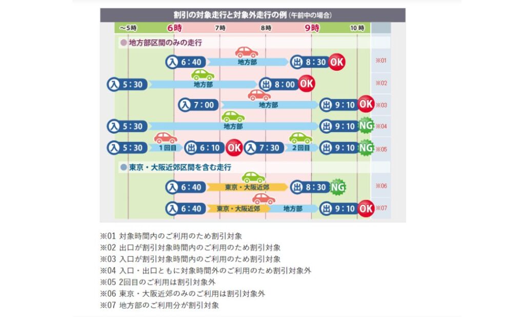 要は、平日の朝:6時~9時 夕:17時~20時の間に高速を利用すると、利用回数によって割引されるサービスだよ^^